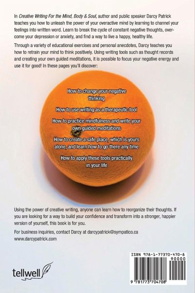 In Creative Writing For the Mind, Body & Soul, author and public speaker Darcy Patrick teaches you how to unleash the power of your overactive mind by learning to channel your feelings into written word. Learn to break the cycle of constant negative thoughts, overcome your depression or anxiety, and find a way to live a happy, healthy life. Through a variety of educational exercises and personal anecdotes, Darcy teaches you how to retrain your mind to think positively. Using writing tools such as thought records and creating your own guided meditations, it is possible to focus your negative energy and use it for good! In these pages you'll discover: • How to change your negative thinking • How to use writing as a therapeutic tool • How to practice mindfulness and write your own guided meditations • How to create a safe place, which is yours alone, and learn how to go there any time • How to apply these tools practically in your life Using the power of creative writing, anyone can learn how to reorganize their thoughts. If you are looking for a way to build your confidence and transform into a stronger, happier version of yourself, this book is for you. For business inquiries, contact Darcy at darcypatrick@sympatico.ca www.darcypatrick.com