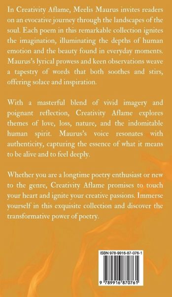 In Creativity Aflame, Meelis Maurus invites readers on an evocative journey through the landscapes of the soul. Each poem in this remarkable collection ignites the imagination, illuminating the depths of human emotion and the beauty found in everyday moments. Maurus's lyrical prowess and keen observations weave a tapestry of words that both soothes and stirs, offering solace and inspiration. With a masterful blend of vivid imagery and poignant reflection, Creativity Aflame explores themes of love, loss, nature, and the indomitable human spirit. Maurus's voice resonates with authenticity, capturing the essence of what it means to be alive and to feel deeply. Whether you are a longtime poetry enthusiast or new to the genre, Creativity Aflame promises to touch your heart and ignite your creative passions. Immerse yourself in this exquisite collection and discover the transformative power of poetry. Copyright © 2024 Book Fairy Publishing
