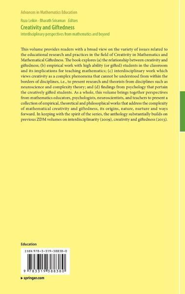 This volume provides readers with a broad view on the variety of issues related to the educational research and practices in the field of Creativity in Mathematics and Mathematical Giftedness. The book explores (a) the relationship between creativity and giftedness; (b) empirical work with high ability (or gifted) students in the classroom and its implications for teaching mathematics; (c) interdisciplinary work which views creativity as a complex phenomena that cannot be understood from within the borders of disciplines, i.e., to present research and theorists from disciplines such as neuroscience and complexity theory; and (d) findings from psychology that pertain the creatively gifted students. As a whole, this volume brings together perspectives from mathematics educators, psychologists, neuroscientists, and teachers to present a collection of empirical, theoretical and philosophical works that address the complexity of mathematical creativity and giftedness, its origins, nature, nurture and ways forward. In keeping with the spirit of the series, the anthology substantially builds on previous ZDM volumes on interdisciplinarity (2009), creativity and giftedness (2013).