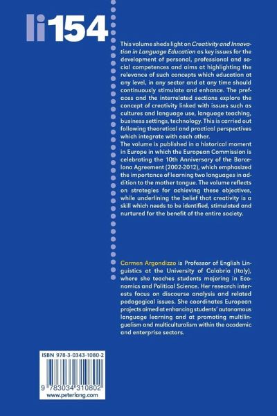 This volume sheds light on Creativity and Innovation in Language Education as key issues for the development of personal, professional and social competences and aims at highlighting the relevance of such concepts which education at any level, in any sector and at any time should continuously stimulate and enhance. The prefaces and the interrelated sections explore the concept of creativity linked with issues such as cultures and language use, language teaching, business settings, technology. This is carried out following theoretical and practical perspectives which integrate with each other. The volume is published in a historical moment in Europe in which the European Commission is celebrating the 10th Anniversary of the Barcelona Agreement (2002-2012), which emphasized the importance of learning two languages in addition to the mother tongue. The volume reflects on strategies for achieving these objectives, while underlining the belief that creativity is a skill which needs to be identified, stimulated and nurtured for the benefit of the entire society.