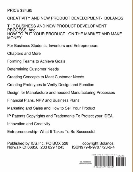 CREATIVITY AND NEW PRODUCT DEVELOPMENT. THE A B C OF THE NEW PRODUCT DEVELOPMENT PROCESS. The 10 chapters includes:Determining customer Needs, Creating Concepts,Making Prototypes, Design for Manufacture,Financial and Business plans, Marketing and Sales, Patents, Copyrights and Trademarks, Innovation and Creativity, and what it takes to be an Entrepreneur. Used for EAS 323 text. Contact the Author at 203 829 1245.