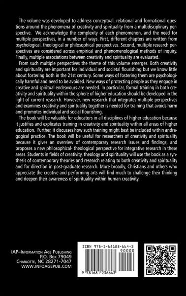 The volume was developed to address conceptual, relational and formational questions around the phenomena of creativity and spirituality from a multidisciplinary perspective. We acknowledge the complexity of each phenomenon, and the need for multiple perspectives, in a number of ways. First, different chapters are written from psychological, theological or philosophical perspectives. Second, multiple research perspectives are considered across empirical and phenomenological methods of inquiry. Finally, multiple associations between creativity and spirituality are evaluated. From such multiple perspectives the theme of this volume emerges. Both creativity and spirituality are important for individual and societal flourishing but we know little about fostering both in the 21st century. Some ways of fostering them are psychologically harmful and need to be avoided. New ways of protecting people as they engage in creative and spiritual endeavours are needed. In particular, formal training in both creativity and spirituality within the sphere of higher education should be developed in the light of current research. However, new research that integrates multiple perspectives and examines creativity and spirituality together is needed for training that avoids harm and promotes individual and social flourishing. The book will be valuable for educators in all disciplines of higher education because it justifies and explicates training in creativity and spirituality within all areas of higher education. Further, it discusses how such training might best be included within andragogical practice. The book will be useful for researchers of creativity and spirituality because it gives an overview of contemporary research issues and findings, and proposes a new philosophical- theological perspective for integrative research in these areas. Students in fields of creativity, theology and spirituality will use the book as a synthesis of contemporary theories and research relating to both creativity and spirituality and for direction in post-graduate research. More broadly, Christians and others who appreciate the creative and performing arts will find much to challenge their thinking and deepen their awareness of spirituality within human creativity.