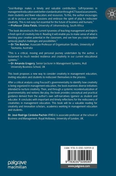 After a critical analysis using Foucault's governmentality to identify how creativity is being organized in management education, this book examines diverse initiatives intended to nurture creativity. Then, and through a systemic recontextualization of governmentality and other notions like play, it provides conceptual and practical guidance derived from the author's own self-narratives (games) as student and educator. The book concludes with important reflections, implications and guidelines for the nurturing in creativity in management education and life in general.