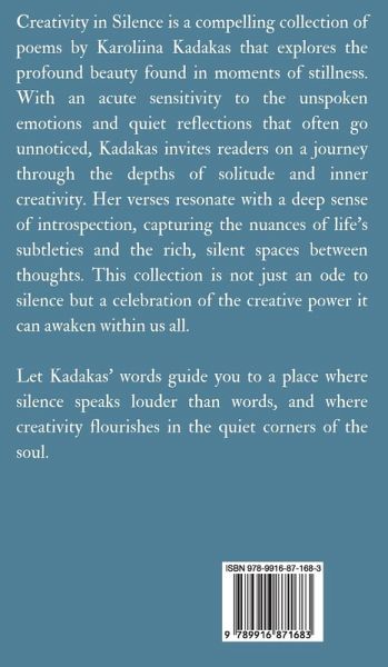 Creativity in Silence is a compelling collection of poems by Karoliina Kadakas that explores the profound beauty found in moments of stillness. With an acute sensitivity to the unspoken emotions and quiet reflections that often go unnoticed, Kadakas invites readers on a journey through the depths of solitude and inner creativity. Her verses resonate with a deep sense of introspection, capturing the nuances of life's subtleties and the rich, silent spaces between thoughts. This collection is not just an ode to silence but a celebration of the creative power it can awaken within us all. Let Kadakas' words guide you to a place where silence speaks louder than words, and where creativity flourishes in the quiet corners of the soul. Copyright © 2024 Swan Charm
