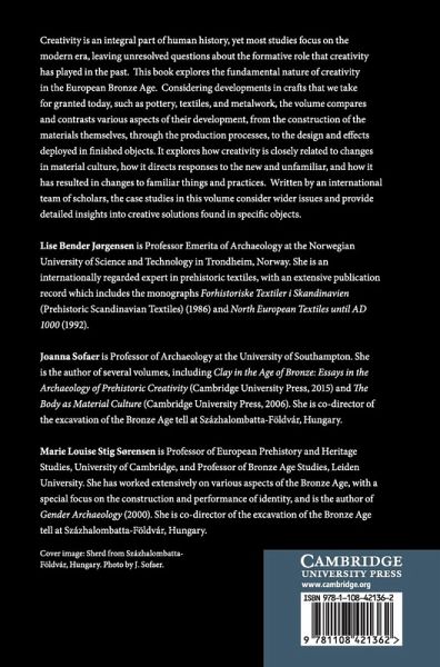 This book explores the nature of creativity in a critical period of human history - the European Bronze Age - through developments in three key crafts - pottery, textiles, and metalwork. It will interest students and teachers of prehistory/archaeology, craft studies (especially textiles, metal, and pottery), as well as those interested in creativity.