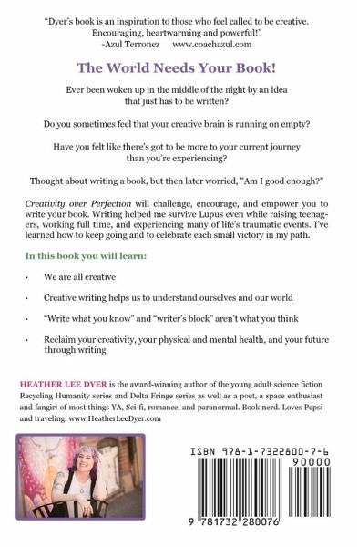 The World Needs Your Book! Ever been woken up in the middle of the night by an idea that just has to be written? Do you sometimes feel that your creative brain is running on empty? Have you felt like there's got to be more to your current journey than you're experiencing? Thought about writing a book, but then later worried, "Am I good enough?" Creativity over Perfectionwill challenge, encourage, and empower you to write your book. Writing helped me survive Lupus even while raising teenagers, working full time, and experiencing many of life's traumatic events. I've learned how to keep going and to celebrate each small victory in my path. In this book you will learn: We are all creative Creative writing helps us to understand ourselves and our world "Write what you know" and "writer's block" aren't what you think Reclaim your creativity, your physical and mental health, and your future through writing