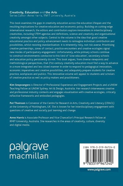 This book examines the gaps in creativity education across the education lifespan and the resulting implications for creative education and economic policy. Building on cutting-edge international research, the editors and contributors explore innovations in interdisciplinary creativities, including STEM agendas and definitions, science and creativity and organisational creativity amongst other subjects. Central to the volume is the idea that good creative educational practice and policy advancement needs to reimagine individual contribution and possibilities, whilst resisting standardization: it is inherently risky, not risk-averse. Prioritising creative partnerships, zones of contact, practice encounters and creative ecologies signal new modes of participatory engagement. Unfortunately, while primary schools continue to construct environments conducive to this kind of 'slow education', secondary schools and education policy persistently do not. This book argues, from diverse viewpoints and methodological perspectives, that 21st-century creativity education must find a way to advance in a more integrated and less siloed manner in order to respond to pedagogical innovation, economic imperatives and creative possibilities, and adequately prepare students for creative practice, workplaces and publics. This innovative volume will appeal to students and scholars of creative practice as well as policy makers and practitioners.