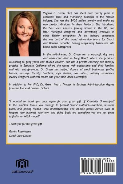 Creativity Unwrapped is for the artists and healing artists among us who have actually finished something, or come close to it, and then put it away, unobserved. It is for those of us whose first really big canvas is rolled up under the bed. Those of us whose illustrated memoir of their experience of surviving breast cancer and how it drew their family together is sitting beautifully tied up with ribbon on the shelf. Those of us whose CD, well mastered and studio quality, sits in a box of a hundred in the garage. Those of us whose gorgeous head shots are in the linen cupboard behind the guest towels somewhere. The Artists in Waiting. Creativity Unwrapped: \ Leads artists to understand the psychological strengths they already possess for promoting their creativity, and where they might need some help. \ Guides artists into a closer relationship with their audience in ways that will make their work more responsive without sacrificing creativity and innovation. \ Helps artists to discover their innate entrepreneurial abilities and use them to show their work. \ Teaches artists how to befriend a calculator, to build a creative business plan, to price their work, to design an idea that is inspiring and efficient. \ Gives detailed and practical information about advertising, networking, public relations, and other forms of communication, reminding the artist that everyone in these professions is an artist, too. \ Provides reflection on the value of play, rest, legacy, and giving back in the creative process. \ Incorporates a spiritual dimension into the artistic entrepreneurial process in an ecumenical and inspiring way.