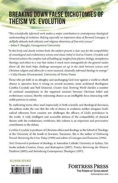 Cynthia Crysdale and Neil Ormerod here present a robust theology of God in light of supposed tensions between Christian belief and evolutionary science. Those who pit faith in an almighty and unchanging God over against a world in which chance is operative have it wrong on several accounts, they insist. Creator God, Evolving World clarifies a number of confused assumptions in an effort to redeem chance as an intelligible force interacting with stable patterns in nature. A proper conception of probabilities and regularities in the worlds unfolding reveals neither random chaos nor a predetermined blueprint but a view of the universe as the fruit of both chance and necessity. By clarifying terms often used imprecisely in both scientific and theological discourse, the authors make the case that the role of chance in evolution neither mitigates Gods radical otherness from creation nor challenges the efficacy of Gods providence in the world.