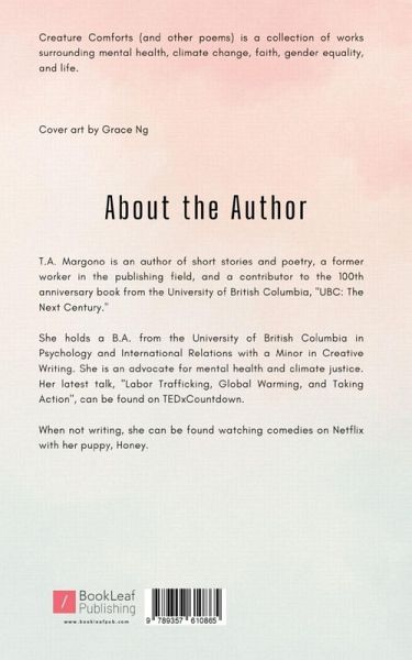 ""Creature Comforts (and other poems) is a collection of works surrounding mental health, climate change, religion, gender equality, and life. Cover art by Grace Ng""