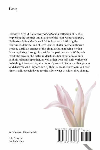 Creature Love: A Poetic Study of a Man is a collection of haikus exploring the textures and nuances of the man, writer and poet, Katherine Batten MacDowell fell in love with. Utilizing the restrained, delicate, and elusive form of Haiku poetry, Katherine seeks to distill an essence of this singular human being she has been exploring through her art for the past two years. With each work she creates, she better understands her experience of him and his relationship to her, as well as her own self. This work seeks to highlight how we may continuously come to know another person and discover who they are, loving them as creatures who unfold over time, thrilling each day to see the subtle ways in which they change.