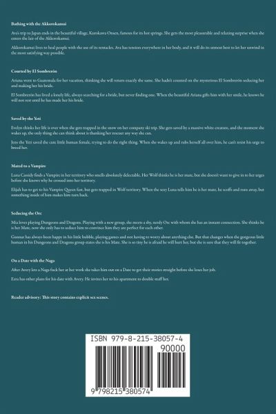 Bathing with the Akkorokamui Ava's trip to Japan ends in the beautiful village, Kurokawa Onsen, famous for its hot springs. She gets the most pleasurable and relaxing surprise when she enters the lair of the Akkorokamui. Akkorokamui lives to heal people with the use of its tentacles. Ava has tension everywhere in her body, and it will do its utmost best to let her unwind in the most satisfying way possible. Courted by El Sombrerón Ariana went to Guatemala for her vacation, thinking she will return exactly the same. She hadn't counted on the mysterious El Sombrerón seducing her and making her his bride. El Sombrerón has lived a lonely life, always searching for a bride, but never finding one. When the beautiful Ariana gifts him with her smile, he knows he will not rest until he has made her his bride. Saved by the Yeti Evelyn thinks her life is over when she gets trapped in the snow on her company ski trip. She gets saved by a massive white creature, and the moment she wakes up, the only thing she can think about is thanking her rescuer any way she can. Jens the Yeti saved the cute little human female, trying to do the right thing. When she wakes up and rubs herself all over him, he can't resist his urge to breed her. Mated to a Vampire Luna Cassidy finds a Vampire in her territory who smells absolutely delectable. Her Wolf thinks he is her mate, but she doesn't want to give in to her urges before she knows why he crossed into her territory. Elijah has to get to his Vampire Queen fast, but gets trapped in Wolf territory. When the sexy Luna tells him he is her mate, he scoffs and runs away, but something inside of him makes him turn back. Seducing the Orc Mia loves playing Dungeons and Dragons. Playing with a new group, she meets a shy, nerdy Orc with whom she has an instant connection. She thinks he is her Mate, now she only has to seduce him to convince him they are perfect for each other. Gunnar has always been happy in his little bubble, playing games and not having to worry about anything else. But that changes when the gorgeous little human in his Dungeons and Dragons group states she is his Mate. She is so tiny he is afraid he will hurt her, but she is sure that they will fit together. On a Date with the Naga After Avery lets a Naga fuck her at her work she takes him out on a Date to get their stories straight before she loses her job. Ezra has other plans for his date with Avery. He invites her to his appartement to double stuff her. --------- Reader advisory: This story contains explicit sex scenes. Creature Loving Volume 2 is a collection of five previously published standalone short erotic stories and one exciting new bonus story. It is filled with human FMC's loving Monsters, Beasts and Creatures. Full-length, explicit sex scenes, standalone, no cheating or cliffhangers. ----------