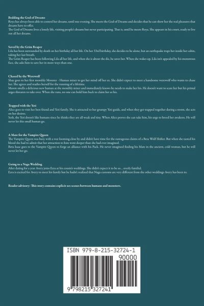 Bedding the God of Dreams Roya has always been able to control her dreams, until one evening. She meets the God of Dreams and decides that he can show her the real pleasures that dreams have to offer. The God of Dreams lives a lonely life, visiting people's dreams but never participating. That is, until he meets Roya. She appears in his court, ready to live out all her dreams. Saved by the Grim Reaper Lila has been surrounded by death on her birthday all her life. On her 33rd birthday, she decides to be alone, but an earthquake traps her inside her cabin, taking her last breath. The Grim Reaper has been following Lila all her life, and when she is about the die, he saves her. When she wakes up, Lila isn't appealed by his monstrous face, she asks him to save her in more ways than one. Chased by the Werewolf Shay goes to her first monthly Monster - Human mixer to get her mind off her ex. She didn't expect to meet a handsome werewolf who wants to chase her. She agrees and readies herself for the running of a lifetime. Mason smells a delicious new human at the monthly mixer and immediately knows he needs to make her his. He doesn't want to scare her but his primal urges threaten to take over. When she runs, no one can hold him back to claim her as his. Trapped with the Yeti Alice goes to visit her best friend and Yeti family. She is attracted to her grumpy Yeti guide, and when they get trapped together during a storm, she acts on her desires. Seth, the Yeti doesn't like humans since he thinks they are all weak and tiny. When Alice proves she can take him, his urge to breed her awakens. He will never let this small human go. A Mate for the Vampire Queen The Vampire Queen was busy with a war looming close by and didn't have time for the outrageous claims of a Beta Wolf Shifter. But when she tasted his blood she had to admit that her attraction to him went deeper than she had ever imagined. Beta Isaac goes to the Vampire Queen to forge an alliance with his Pack. He never imagined finding his Mate in the ancient, cold woman, but he will never let her go. Going to a Naga Wedding After dating for a year Avery joins Ezra at his cousin's weddings. She didn't expect it to be so… overly familial. Ezra is excited for Avery to meet his family but he hadn't realized that Naga customs are very different from the other weddings Avery has been to. --------- Reader advisory: This story contains explicit sex scenes. Creature Loving Volume 3 is a collection of five previously published standalone short erotic stories and one exciting new bonus story. It is filled with human FMC's loving Monsters, Beasts and Creatures. Explicit sex scenes, standalone, no cheating or cliffhangers. ----------