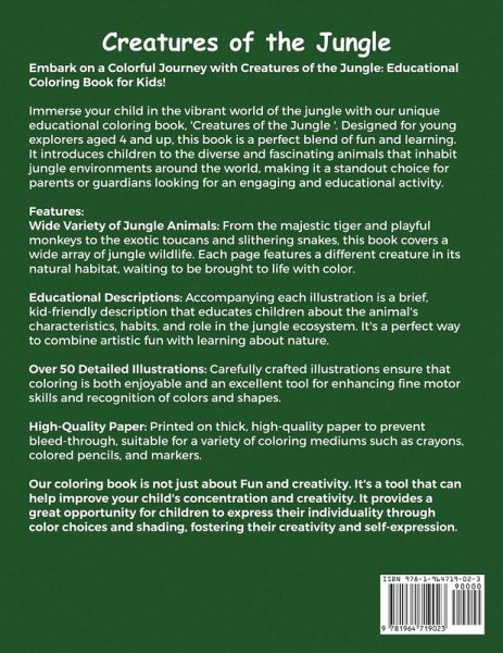 Embark on a Colorful Journey with 'Creatures of the Jungle: Educational Coloring Book' for Kids! Trim size: 8.5x11 Dive into the lush and vibrant world of the jungle with our educational coloring book designed for young explorers aged 4 and up. 'Creatures of the Jungle' offers a unique blend of fun and learning, introducing children to the diverse and fascinating animals that inhabit jungle environments around the world. Features:Wide Variety of Jungle Animals: From the majestic tiger and playful monkeys to the exotic toucans and slithering snakes, this book covers a wide array of jungle wildlife. Each page features a different creature in its natural habitat, waiting to be brought to life with color. Educational Descriptions: Accompanying each illustration is a brief, kid-friendly description that educates children about the animal's characteristics, and role in the jungle ecosystem. It's a perfect way to combine artistic fun with learning about nature. Over 50 Detailed Illustrations: Carefully crafted illustrations ensure that coloring is both enjoyable and a great tool for enhancing fine motor skills and recognition of colors and shapes. High-Quality Paper: Printed on thick, high-quality paper to prevent bleed-through, suitable for a variety of coloring mediums such as crayons, colored pencils, and markers. Ideal for Developing Creativity: Coloring can help improve concentration and creativity, and provides a great opportunity for children to express their individuality through color choices and shading. 'Creatures of the Jungle: Educational Coloring Book' is more than just a coloring book; it's an adventure that sparks curiosity about the natural world, making it an ideal gift for children who love animals and the outdoors. Perfect for quiet afternoons, educational activities, and fostering an early love for wildlife and ecosystems. Get your copy today and join the adventure in the depths of the jungle!