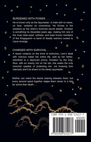 Burdened with power ... He is known only as the Spymaster. A male with no name, no face, certainly no conscience. He thrives in the shadows as the realm's foremost secret stealer. Emotion is something he discarded years ago, making him one of the most clear-eyed, ruthless, and least known members of the Kingsguard - a band of deadly warriors cursed to crave revenge. Charged with survival ... A lesser creature on the brink of extinction, Leni's dealt with onerous males her entire life, sold by her father, betrothed to a depraved prince, forsaken by the king. Now, with an enemy hot on her tail, she seeks the only immortal capable of protecting her, not knowing how intensely she'll be drawn to the steely spymaster. Neither can resist the desire searing between them, but every second spent together edges them closer to a fate far worse than death ...