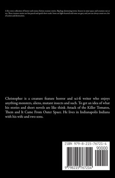A five story collection of horror and science fiction creature stories. Big bugs destroying towns. Insects in outer space and creatures out at sea. These creature stories are fast paced and quick short reads. Some are light-hearted and some are gory and you can always count on a lot of action and destruction.