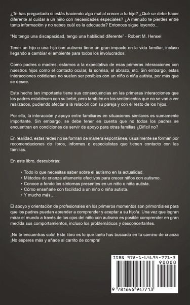 ¿Te has preguntado si estás haciendo algo mal al crecer a tu hijo? ¿Qué se debe hacer diferente al cuidar a un niño con necesidades especiales? ¿A menudo te pierdes entre tanta información y no sabes cuál es la adecuada? Entonces sigue leyendo... "No tengo una discapacidad, tengo una habilidad diferente" - Robert M. Hensel Tener un hijo o una hija con autismo tiene un gran impacto en la vida familiar, incluso llegando a cambiar el ambiente para todos los involucrados. Como padres o madres, estamos a la expectativa de esas primeras interacciones con nuestros hijos como el contacto ocular, la sonrisa, el abrazo, etc. Sin embargo, estas interacciones cotidianas no suelen ser posibles con un niño o niña autista, por más que se desee. Este hecho tan importante tiene sus consecuencias en las primeras interacciones que los padres establecen con su bebé, pero también en los sentimientos que no se van a ver realizados, pudiendo afectar a la relación con su pareja y con el resto de los hijos. Por ello, la interacción y apoyo entre familiares en situaciones similares es sumamente importante. Sin embargo, se debe tener en cuenta que no todos los padres se encuentran en condiciones de servir de apoyo para otras familias ¿Difícil no? En realidad, estas redes no se forman de manera espontánea, usualmente se forman por recomendaciones de libros, informes o especialistas que tienen contacto con las familias. En este libro, descubrirás: Todo lo que necesitas saber sobre el autismo en la actualidad. Métodos de crianza altamente efectivos para crecer niños con autismo. Conoce a fondo los síntomas presentes en un niño o niña autista. Cómo enseñarle con facilidad a un niño o niña autista. Y mucho más... El apoyo y orientación de profesionales en los primeros momentos son primordiales para que los padres puedan aprender a comprender y aceptar a su hijo/a. Una vez que logran mirar el mundo a través de los ojos del niño con autismo es posible comprender en gran medida sus comportamientos, incluso los problemáticos y desconcertantes. ¡No te encuentras solo! Este libro es lo que tanto has buscado en tu camino de crianza ¡No esperes más y añade al carrito de compra!