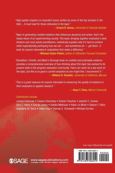 Part I: Introduction 1. Examining the Backbone of Contemporary Evaluation Practice: Credible and Actionable Evidence - Stewart I. Donaldson 2. Social Inquiry Paradigms as a Frame for the Debate on Credible Evidence - Christina A. Christie and Dreolin Fleischer 3. How People Judge the Credibility of Information: Lessons for Evaluation From Cognitive and Information Sciences - Robin Lin Miller Part II: Credible and Actionable Evidence: The Role of Randomized Experiments 4. When Getting It Right Matters: The Struggle for Rigorous Evidence of Impact and to Increase Its Influence Continues - Gary T. Henry 5. Randomized Controlled Trials: A Gold Standard or Gold Plated? - Leonard Bickman and Stephanie M. Reich 6. Demythologizing Causation and Evidence - Michael Scriven Part III: Credible and Actionable Evidence: Perspectives From a Range of Evaluation Designs and Methods 7. When and How Qualitative Methods Provide Credible and Actionable Evidence: Reasoning With Rigor, Probity, and Transparency - Sharon F. Rallis 8. Seeing Is Believing: Using Images as Evidence in Evaluation - Sandra Mathison 9. Credibility, Policy Use, and the Evaluation Synthesis - Eleanor Chelimsky Part IV: Credible and Actionable Evidence: General Perspectives 10. How Evidence Earns Credibility in Evaluation - Jennifer C. Greene 11. Actionable Evidence in Context: Contextual Influences on Adequacy and Appropriateness of Method Choice in Evaluation - George Julnes and Debra Rog 12. Credible Evidence of Effectiveness: Necessary but Not Sufficient - Thomas A. Schwandt 13. Credible and Actionable Evidence: A Framework, Overview, and Suggestions for Future Practice and Research - Melvin M. Mark
