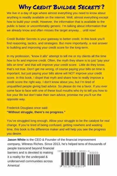 Credit Builder Secrets is your gateway to better credit. In this book you'll find reasoning, tactics, and strategies to help you improve your credit score up to 200 points! In my profession, "know it alls" attempt to tell me or my clients all the time how to fix and improve credit. Often, the myth they share is to just "pay your bills on time" and that will improve your credit score. Little do they know, that's not true. Don't get me wrong, of course paying your bills on time is important, but just paying your bills alone will NOT improve your credit score. In this book, I dispel that myth and share how to really improve a credit score the right way. I don't know about you, but I'm tired of unqualified people giving bad advice. So please do me a favor. If you ever come face to face with one of these loud mouths who try to tell you how to live your life but don't take their own advice, promise me you'll run the opposite way.
