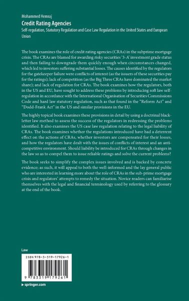 The book examines the role of credit rating agencies (CRAs) in the subprime mortgage crisis. The CRAs are blamed for awarding risky securities '3-A' investment grade status and then failing to downgrade them quickly enough when circumstances changed, which led to investors suffering substantial losses. The causes identified by the regulators for the gatekeeper failure were conflicts of interest (as the issuers of these securities pay for the ratings); lack of competition (as the Big Three CRAs have dominated the market share); and lack of regulation for CRAs. The book examines how the regulators, both in the US and EU, have sought to address these problems by introducing soft law self-regulation in accordance with the International Organisation of Securities Commissions Code and hard law statutory regulation, such as that found in the "Reform Act" and "Dodd-Frank Act" in the US and similar provisions in the EU.