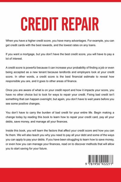 If you want to discover how to effectively repair your credit, pay off debt and save money, then keep reading... Are you sick and tired of being the victim of faulty credit reporting or mistakes of the past? Have you thought about doing something about your credit score but feel overwhelmed and don't know where to start? Do you finally want to say goodbye to being worried the next time a potential employer, landlord or bank says they are going to check your credit? If so, then you've come to the right place. You see, improving your credit score doesn't have to be as difficult as many think it is. Inside this book, you will learn the factors that affect your credit score and how you can fix them. You will also discover ways to pay off debt. If you have been struggling to save money or manage your finances effectively, then this book will give you the methods that will allow you to start saving for your future. In this book, you will learn about: Boosting Your Credit Score Paying Off Debt Saving Money Managing Your Personal Finances in a Stress-Free Way And much, much more! Take a second to imagine how you'll feel once you have increased the probability of finding a job or even being accepted as a new tenant because employers and landlords now look at you differently. And how your family and friends will react when you have your finances in order. So even if you've made financial mistakes in the past, you can start moving your finances in the right direction. And if you have a burning desire to boost your credit score, pay off debt and save money, then scroll up and click "add to cart"!