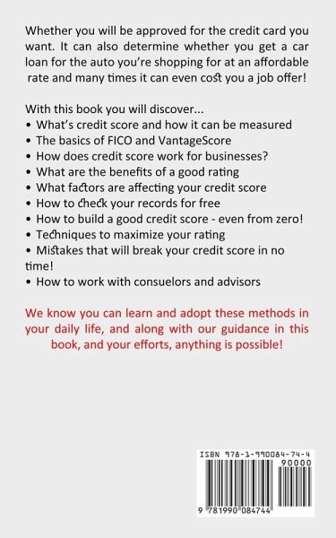 Whether you will be approved for the credit card you want. It can also determine whether you get a car loan for the auto you're shopping for at an affordable rate and many times it can even cost you a job offer! With this book you will discover... ¿ What's credit score and how it can be measured ¿ The basics of FICO and VantageScore ¿ How does credit score work for businesses? ¿ What are the benefits of a good rating ¿ What factors are affecting your credit score ¿ How to check your records for free ¿ How to build a good credit score - even from zero! ¿ Techniques to maximize your rating ¿ Mistakes that will break your credit score in no time! ¿ How to work with consuelors and advisors We know you can learn and adopt these methods in your daily life, and along with our guidance in this book, and your efforts, anything is possible!
