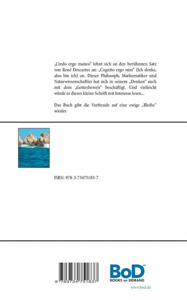 Unsere Kirchen werden immer leerer, und in anderen Ländern werden Christen so verfolgt wie noch nie in der Geschichte.Da ist wohl die Frage sehr berechtigt: Was bleibt? Das Wort bleiben hat im christlichen Glauben eine zentrale und wichtige Bedeutung. Mit diesem Buch möchte ich einige der schönsten Aspekte des Bleibens hervorheben und bewusst machen.Unser Glaube ist sowohl realistisch als auch zukunftsorientiert.Denn wir haben hierkeine bleibende Stadt,sondern die zukünftige suchen wir.Hebr. 13, 14Credo ergo maneo lehnt sich natürlich an den berühmten Satz von René Descartes an: Cognito ergo sum (Ich denke, also bin ich) an. Dieser Philosoph, Mathematiker und Naturwissenschaftler hatte sich in seinem Denken auch mit dem Gottesbeweis beschäftigt. Und vielleicht würde er dieses kleine Schrift sogar mit Interesse lesen.Die Texte aus der Bibel (Lutherübersetzung 1984) und unseren Liedern geben die Vorfreude auf eine ewige Bleibe wieder.Herausgeber: Adlerstein Verlag