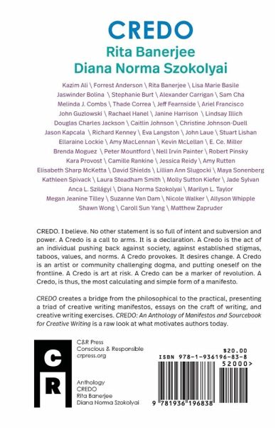 CREDO. I believe. No other statement is so full of intent and subversion and power. A Credo is a call to arms. It is a declaration. A Credo is the act of an individual pushing back against society, against established stigmas, taboos, values, and norms. A Credo provokes. It desires change. A Credo is an artist or community challenging dogma, and putting oneself on the frontline. A Credo is art at risk. A Credo can be a marker of revolution. A Credo, is thus, the most calculating and simple form of a manifesto. CREDO creates a bridge from the philosophical to the practical, presenting a triad of creative writing manifestos, essays on the craft of writing, and creative writing exercises. CREDO: An Anthology of Manifestos and Sourcebook for Creative Writing is a raw look at what motivates authors today.
