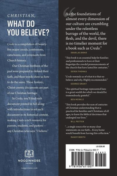 Nogginnose Press presents Credo, a compilation of major creeds, confessions, catechisms, and covenants from Church history. Our Christian brethren of the past were prepared to defend their faith, and their words show us how to do the same. These historic, Christ-centric documents are part of our Christian heritage, and compiling these into a single volume makes Credo a rich resource for parents, students, and pastors. Credo features twenty-five documents from Church history, including:Apostles' Creed (4th century) Nicene Creed (325) Chalcedonian Creed (451) Athanasian Creed (c. 6th century) Ten Theses of Berne (1528) Augsburg Confession (1530) Gallican Confession (1559) Scots Confession (1560) Belgic Confession (1561) Canons of Dort (1619) Westminster Confession of Faith (1646) Savoy Declaration (1658) Second London Baptist Confession (1689) Luther's Small Catechism (1529) Geneva Catechism (1560) Heidelberg Catechism (1563) Westminster Shorter Catechism (1647) Keach's Catechism (1689) Watertown Covenant (1630) Covenant of the First Church in Boston (1630) Salem Covenants (1629-1636) Dedham Covenant (1636) Scottish National Covenant (1638) Solemn League and Covenant (1643) The Children's Bond (1684) In Credo, you'll find each document printed in full along with introductions to set each document in its historical context, making Credo a rich resource for parents, students, and pastors--any Christian who says "I believe."