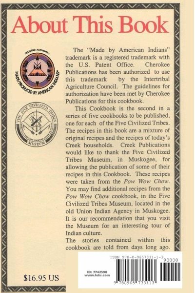 This cookbook is the second in a series to be published, one for each of the Five Civilized Tribes, the Cherokee Nation, the Creek Muskogee Nation, the Choctaw Nation, the Chickasaw Nation and the Seminole Nation. This publication would like to thank the Five Civilized Tribes Museum in Muskogee,OK for their assistance with this book and will recommend each reader to visit the Museum for an interesting tour of Native American Culture.
