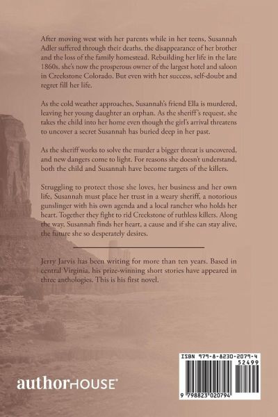After moving west with her parents while in her teens, Susannah Adler suffered through their deaths, the disappearance of her brother and the loss of the family homestead. Rebuilding her life in the late 1860s, she's now the prosperous owner of the largest hotel and saloon in Creekstone Colorado. But even with her success, self-doubt and regret fill her life. As the colder weather approaches, Susannah's long-time friend Ella is murdered, a crime leaving her young daughter an orphan. At the sheriff's request, she takes the child into her life, all the while knowing her arrival threatens to uncover a secret Susannah would prefer to remain buried in her past. Helping the sheriff find clues to the murder, a wider, bigger threat is uncovered, and new dangers come to light. For reasons she doesn't yet understand, both the child and Susannah have become targets of the killers. Struggling to protect those she loves, her business and her own life, Susannah must place her trust in a weary sheriff, a notorious gunslinger with his own agenda and a local rancher who holds her heart. Together they fight to rid Creekstone of ruthless killers. Along the way, Susannah finds her heart, a cause and if she can stay alive, the future she so desperately desires.