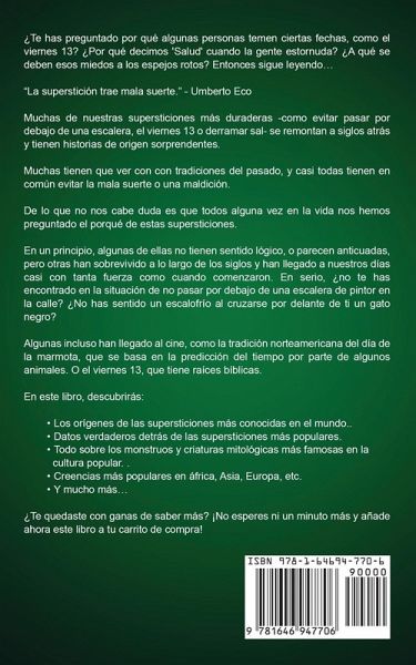 ¿Te has preguntado por qué algunas personas temen ciertas fechas, como el viernes 13? ¿Por qué decimos 'Salud' cuando la gente estornuda? ¿A qué se deben esos miedos a los espejos rotos? Entonces sigue leyendo... "La superstición trae mala suerte." - Umberto Eco Muchas de nuestras supersticiones más duraderas -como evitar pasar por debajo de una escalera, el viernes 13 o derramar sal- se remontan a siglos atrás y tienen historias de origen sorprendentes. Muchas tienen que ver con con tradiciones del pasado, y casi todas tienen en común evitar la mala suerte o una maldición. De lo que no nos cabe duda es que todos alguna vez en la vida nos hemos preguntado el porqué de estas supersticiones. En un principio, algunas de ellas no tienen sentido lógico, o parecen anticuadas, pero otras han sobrevivido a lo largo de los siglos y han llegado a nuestros días casi con tanta fuerza como cuando comenzaron. En serio, ¿no te has encontrado en la situación de no pasar por debajo de una escalera de pintor en la calle? ¿No has sentido un escalofrío al cruzarse por delante de ti un gato negro? Algunas incluso han llegado al cine, como la tradición norteamericana del día de la marmota, que se basa en la predicción del tiempo por parte de algunos animales. O el viernes 13, que tiene raíces bíblicas. En este libro, descubrirás: Los orígenes de las supersticiones más conocidas en el mundo.. Datos verdaderos detrás de las supersticiones más populares. Todo sobre los monstruos y criaturas mitológicas más famosas en la cultura popular. . Creencias más populares en áfrica, Asia, Europa, etc. Y mucho más... ¿Te quedaste con ganas de saber más? ¡No esperes ni un minuto más y añade ahora este libro a tu carrito de compra!
