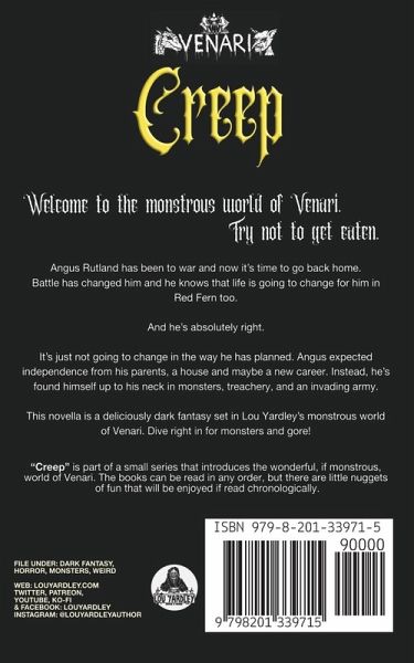 Welcome to the monstrous world of Venari... try not to get eaten... Angus Rutland has been to war and now it's time to go back home. Battle has changed him and he knows that life is going to change for him in Red Fern too. And he's absolutely right. It's just not going to change in the way he has planned. Angus expected independence from his parents, a house and maybe a new career. Instead, he's found himself up to his neck in monsters, treachery, and an invading army. This novella is a deliciously dark fantasy set in Lou Yardley's monstrous world of Venari. Dive right in for monsters and gore! "Creep" is part of a small series that introduces the wonderful, if monstrous, world of Venari. The books can be read in any order, but there are little nuggets of fun that will be enjoyed if read chronologically. "Creep" is set several years before "Banished".