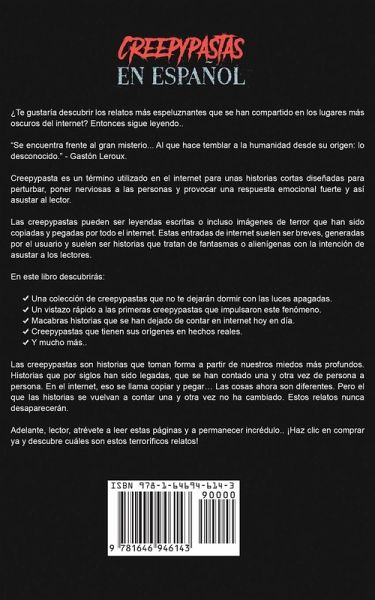¿Te gustaría descubrir los relatos más espeluznantes que se han compartido en los lugares más oscuros del internet? Entonces sigue leyendo.. "Se encuentra frente al gran misterio... Al que hace temblar a la humanidad desde su origen: lo desconocido." - Gastón Leroux. Creepypasta es un término utilizado en el internet para unas historias cortas diseñadas para perturbar, poner nerviosas a las personas y provocar una respuesta emocional fuerte y así asustar al lector. Las creepypastas pueden ser leyendas escritas o incluso imágenes de terror que han sido copiadas y pegadas por todo el internet. Estas entradas de internet suelen ser breves, generadas por el usuario y suelen ser historias que tratan de fantasmas o alienígenas con la intención de asustar a los lectores. En este libro descubrirás: -Una colección de creepypastas que no te dejarán dormir con las luces apagadas. -Un vistazo rápido a las primeras creepypastas que impulsaron este fenómeno. -Macabras historias que se han dejado de contar en internet hoy en día. -Creepypastas que tienen sus orígenes en hechos reales. -Y mucho más.. Las creepypastas son historias que toman forma a partir de nuestros miedos más profundos. Historias que por siglos han sido legadas, que se han contado una y otra vez de persona a persona. En el internet, eso se llama copiar y pegar... Las cosas ahora son diferentes. Pero el que las historias se vuelvan a contar una y otra vez no ha cambiado. Estos relatos nunca desaparecerán. Adelante, lector, atrévete a leer estas páginas y a permanecer incrédulo.. ¡Haz clic en comprar ya y descubre cuáles son estos terroríficos relatos!