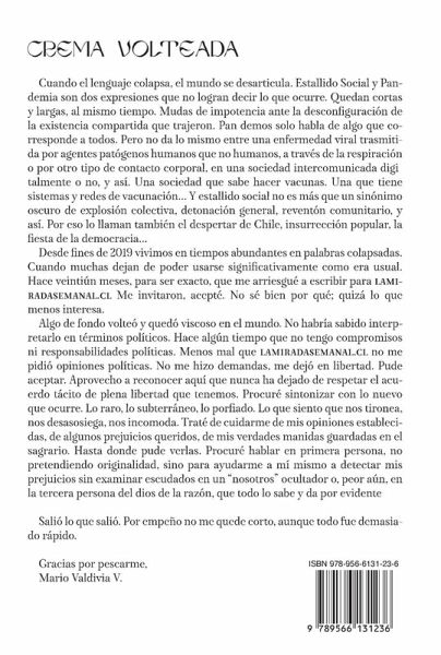 Cuando el lenguaje colapsa, el mundo se desarticula. Estallido Social y Pandemia son dos expresiones que no logran decir lo que ocurre. Quedan cortas y largas, al mismo tiempo. Mudas de impotencia ante la desconfiguración de la existencia compartida que trajeron. Pan demos solo habla de algo que corresponde a todos. Pero no da lo mismo entre una enfermedad viral trasmitida por agentes patógenos humanos que no humanos, a través de la respiración o por otro tipo de contacto corporal, en una sociedad intercomunicada digitalmente o no, y así. Una sociedad que sabe hacer vacunas. Una que tiene sistemas y redes de vacunación... Y estallido social no es más que un sinónimo oscuro de explosión colectiva, detonación general, reventón comunitario, y así. Por eso lo llaman también el despertar de Chile, insurrección popular, la fiesta de la democracia... Desde fines de 2019 vivimos en tiempos abundantes en palabras colapsadas. Cuando muchas dejan de poder usarse significativamente como era usual. Hace veintiún meses, para ser exacto, que me arriesgué a escribir para LAMIRADASEMANAL.-CL Me invitaron, acepté. No sé bien por qué; quizá lo que menos interesa. Algo de fondo volteó y quedó viscoso en el mundo. No habría sabido interpretarlo en términos políticos. Hace algún tiempo que no tengo compromisos ni responsabilidades políticas. Menos mal que lamiradasemanal.cl no me pidió opiniones políticas. No me hizo demandas, me dejó en libertad. Pude aceptar. Aprovecho a reconocer aquí que nunca ha dejado de respetar el acuerdo tácito de plena libertad que tenemos. Procuré sintonizar con lo nuevo que ocurre. Lo raro, lo subterráneo, lo porfiado. Lo que siento que nos tironea, nos desasosiega, nos incomoda. Traté de cuidarme de mis opiniones establecidas, de algunos prejuicios queridos, de mis verdades manidas guardadas en el sagrario. Hasta donde pude verlas. Procuré hablar en primera persona, no pretendiendo originalidad, sino para ayudarme a mí mismo a detectar mis prejuicios sin examinar escudados en un "nosotros" ocultador o, peor aún, en la tercera persona del dios de la razón, que todo lo sabe y da por evidente. Salió lo que salió. Por empeño no me quede corto, aunque todo fue demasiado rápido. Gracias por pescarme, Mario Valdivia V.