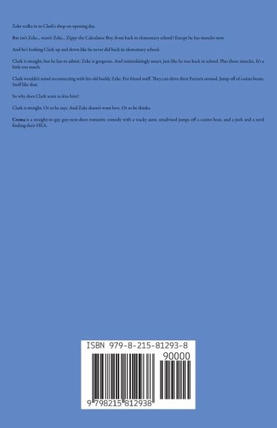 Zeke walks in to Clark's shop on opening day. But isn't Zeke... wasn't Zeke... Zippy the Calculator Boy, from back in elementary school? Except he has muscles now. And he's looking Clark up and down like he never did back in elementary school. Clark is straight, but he has to admit: Zeke is gorgeous. And intimidatingly smart, just like he was back in school. Plus those muscles. It's a little too much. Clark wouldn't mind reconnecting with his old buddy Zeke. For friend stuff. They can drive their Ferraris around. Jump off of casino boats. Stuff like that. So why does Clark want to kiss him? Clark is straight. Or so he says. And Zeke doesn't want love. Or so he thinks. Crema is a straight-to-gay guy-next-door romantic comedy with a wacky aunt, unadvised jumps off a casino boat, and a jock and a nerd finding their HEA.