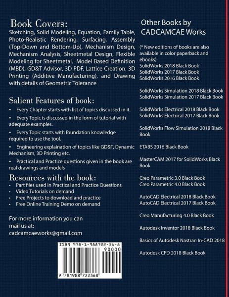 The Creo Parametric 5.0 Black Book is the third edition of our series on Creo Parametric. With lots of additions and thorough review, we present a book to help professionals as well as learners in creating some of the most complex solid models. The book follows a step by step methodology. In this book, we have tried to give real-world examples with real challenges in designing. We have tried to reduce the gap between university use of Creo Parametric and industrial use of Creo Parametric. This edition of book includes many new features of Creo Parametric like 3D printing, MBD (Model Based Definition), Family tables, Mechanism Design, 3D PDFs, and so on. The book covers almost all the information required by a learner to master Creo Parametric. The book starts with sketching and ends at advanced topics like Sheetmetal, Surface Design, 3D Printing and MBD. Some of the salient features of this book are : In-Depth explanation of concepts Every new topic of this book starts with the explanation of the basic concepts. In this way, the user becomes capable of relating the things with real world. Topics Covered Every chapter starts with a list of topics being covered in that chapter. In this way, the user can easy find the topic of his/her interest easily. Instruction through illustration The instructions to perform any action are provided by maximum number of illustrations so that the user can perform the actions discussed in the book easily and effectively. There are about 1250 small and large illustrations that make the learning process effective. Tutorial point of view At the end of concept’s explanation, the tutorial make the understanding of users firm and long lasting. Almost each chapter of the book has tutorials that are real world projects. Moreover most of the tools in this book are discussed in the form of tutorials. Project Free projects and exercises are provided to students for practicing. For Faculty If you are a faculty member, then you can ask for video tutorials on any of the topic, exercise, tutorial, or concept..