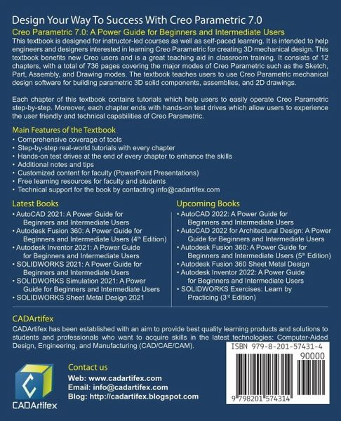 Creo Parametric 7.0: A Power Guide for Beginners and Intermediate Users textbook is designed for instructor-led courses as well as self-paced learning. It is intended to help engineers and designers interested in learning Creo Parametric for creating 3D mechanical design. This textbook benefits new Creo users and is a great teaching aid in classroom training. It consists of 12 chapters, with a total of 736 pages covering the major modes of Creo Parametric such as the Sketch, Part, Assembly, and Drawing modes. The textbook teaches users to use Creo Parametric mechanical design software for building parametric 3D solid components, assemblies, and 2D drawings. This textbook not only focuses on the usage of the tools/commands of Creo Parametric but also on the concept of design. Each chapter of this textbook contains tutorials which help users to easily operate Creo Parametric step-by-step. Moreover, each chapter ends with hands-on test drives which allow users to experience the user friendly and technical capabilities of Creo Parametric.