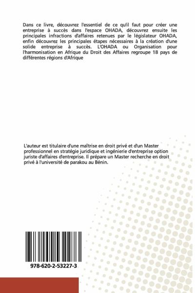 Dans ce livre, découvrez l'essentiel de ce qu'il faut pour créer une entreprise à succès dans l'espace OHADA, découvrez ensuite les principales infractions d'affaires retenues par le législateur OHADA, enfin découvrez les principales étapes nécessaires à la création d'une solide entreprise à succès. L'OHADA ou Organisation pour l'harmonisation en Afrique du Droit des Affaires regroupe 18 pays de différentes régions d'Afrique