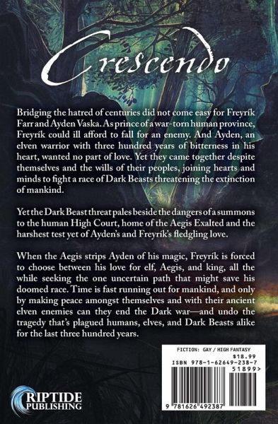 Bridging the hatred of centuries did not come easy for Freyrík Farr and Ayden Vaska. As prince of a war-torn human province, Freyrík could ill afford to fall for an enemy. And Ayden, an elven warrior with three hundred years of bitterness in his heart, wanted no part of love. Yet they came together despite themselves and the wills of their peoples, joining hearts and minds to fight a race of Dark Beasts threatening the extinction of mankind. Yet the Dark Beast threat pales beside the dangers of a summons to the human High Court, home of the Aegis Exalted and the harshest test yet of Ayden's and Freyrík's fledgling love. When the Aegis strips Ayden of his magic, Freyrík is forced to choose between his love for elf, Aegis, and king, all the while seeking the one uncertain path that might save his doomed race. Time is fast running out for mankind, and only by making peace amongst themselves and with their ancient elven enemies can they end the Dark war-and undo the tragedy that's plagued humans, elves, and Dark Beasts alike for the last three hundred years.