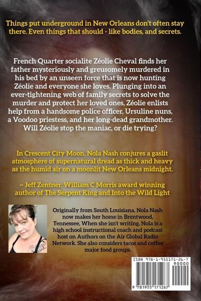 Originally from South Louisiana, Nola Nash now makes her home in Brentwood, Tennessee. She grew up in Baton Rouge, but her biggest writing inspiration was the city of New Orleans, which gave her a love of the magic, mystery, and history at an early age. When she isn't writing, Nola is an online high school instructional coach and podcast host on Dead Folks Tales, BYOB, and The Otherworlds for Authors on the Air Global Radio Network. She is the author of five books: Crescent City Moon, Crescent City Sin, Traveler, Watcher, and House of Mirrors.