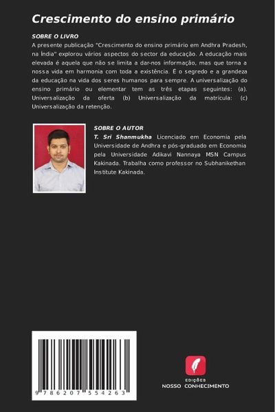 SOBRE O LIVROA presente publicação "Crescimento do ensino primário em Andhra Pradesh, na Índia" explorou vários aspectos do sector da educação. A educação mais elevada é aquela que não se limita a dar-nos informação, mas que torna a nossa vida em harmonia com toda a existência. É o segredo e a grandeza da educação na vida dos seres humanos para sempre. A universalização do ensino primário ou elementar tem as três etapas seguintes: (a). Universalização da oferta (b) Universalização da matrícula: (c) Universalização da retenção.
