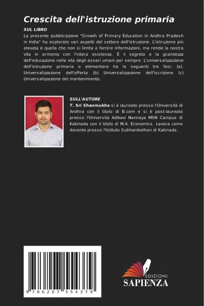 SUL LIBROLa presente pubblicazione "Growth of Primary Education in Andhra Pradesh in India" ha esplorato vari aspetti del settore dell'istruzione. L'istruzione più elevata è quella che non si limita a fornire informazioni, ma rende la nostra vita in armonia con l'intera esistenza. È il segreto e la grandezza dell'educazione nella vita degli esseri umani per sempre. L'universalizzazione dell'istruzione primaria o elementare ha le seguenti tre fasi: (a). Universalizzazione dell'offerta (b) Universalizzazione dell'iscrizione (c) Universalizzazione del mantenimento.