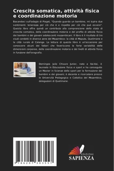Basandosi sull'adagio di Piaget, "Quando guardo un bambino, mi ispira due sentimenti: tenerezza per ciò che è e rispetto per ciò che può essere". Questo libro offre quindi un contributo alla comprensione dello stato di crescita somatica, della coordinazione motoria e del profilo di attività fisica dei bambini e dei giovani adolescenti mozambicani. Il libro è il risultato di tre studi condotti in diverse zone del Mozambico: la città di Maputo, Quelimane e la città rurale di Calanga. La lettura di questo libro è un'occasione per conoscere alcuni dei fattori che favoriscono la forte variabilità delle dimensioni corporee, della coordinazione motoria e dei livelli di attività fisica in funzione dell'orografia.