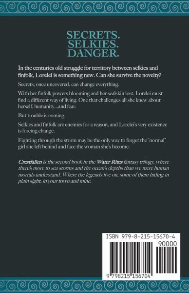 In the centuries old struggle for territory between selkies and finfolk, Lorelei is something new. Can she survive the novelty? Crestfallen is the second book in the Water Rites fantasy trilogy, where there's more to sea storms and the ocean's depths than we mere human mortals understand. Where the legends live on, some of them hiding in plain sight, in your town and mine. Secrets, once uncovered, can change everything. With her finfolk powers blooming and her sealskin lost, Lorelei must find a different way of living. One that challenges all she knew about herself, humanity...and fear. But trouble is coming. Selkies and finfolk are enemies for a reason, and Lorelei's very existence is forcing change. Fighting through the storm may be the only way to forget the "normal" girl she left behind and face the woman she's become. The Complete Water Rites Series Is Available Now Water Rites ~ Book 1 Crestfallen ~ Book 2 Castle and Crown ~ Book 3
