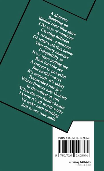 Cresting Hillsides is a collection of 45 poems about how each chapter in your life is a journey. This poetry collection is about a beautiful hillside: one of adventure, romance, and reflection. It is about finding a new perspective. Realizing some hillsides will never be climbed again but that doesn't mean they can't be remembered with wonder. This hillside is about seeking the warmth of summer in the middle of winter. This hillside is about how beautiful and fleeting a sunrise is, just like the people who glide in and out of your life. This hillside is only a chapter of the story, but cherished nonetheless. The book contains whimsical, hand-drawn illustrations.