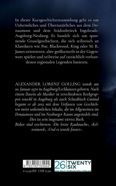 Bereits in einem…mehrWer Kurzgeschichten und sich gerne gruseln mag, dem kann ich ,,Creszentia“ von Alexander Lorenz Golling mit gutem Gewissen ans Herz legen. 11 Schauergeschichten, die teils autobiografisch angehaucht sind vermischen sich mit Legenden, die sich rund um Augsburg, Neuburg und Ingoldstadt bewegen und man als Leser das eine oder andere Mal im geheimnisvollen Donaumoos landet.