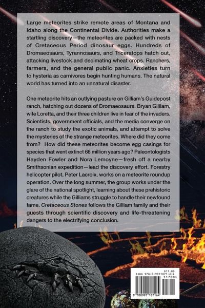 First there was Jurassic Park Now there are Cretaceous Stones . . . Dinosaurs have returned to Earth! Spectacular meteor showers light up the sky. Large meteorites strike remote areas of Montana and Idaho along the Continental Divide. Authorities make a startling discovery-the meteorites are packed with nests of Cretaceous Period dinosaur eggs. Hundreds of Dromaeosaurs, Tyrannosaurs, and Triceratops hatch out, attacking livestock and decimating wheat crops. Ranchers, farmers, and the general public panic. Anxieties turn to hysteria as carnivores begin hunting humans. The natural world has erupted into an unnatural disaster. One meteorite hits an outlying pasture on Gilliam's Guidepost ranch, hatching out dozens of Cretaceous dinosaurs. Bryan Gilliam, wife Loretta, and their three children live in fear of the creatures. Scientists, government officials, and the media converge on the ranch. Where did the strange meteorites come from? How did they become egg casings for species that went extinct 66 million years ago? Paleontologists Hayden Fowler and Nora Lemoyne-fresh off a nearby Smithsonian expedition dig-lead the discovery effort. Forestry helicopter pilot, Peter Lacroix, works on a meteorite roundup operation. Over the long summer, they work with a group of scientists under the glare of the national spotlight, studying the Dromaeosaurs, Tyrannosaurs, and Triceratopses being held in captivity at the Gilliam ranch. Meanwhile, ranchers, farmers, and citizens of Montana and Idaho face life-threatening perils from dinosaur hatchlings in the wild. Cretaceous Stones follows the Gilliam family as they deal with their fears and struggle with their newfound fame. The novel also follows the scientific community through its discovery process and a government trying to control invasive prehistoric species that are running amok. It's a wild ride indeed. Print Length: 487 pages Book 1 in the Cretaceous Chronicles trilogy