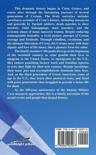 Cretan Courage: The Milatos Cave and Beyond is a dramatic family history, beginning in Crete, Greece, which comes alive through the fascinating, multi-generational journey of Greek Cretans. The lively narrative includes eyewitness descriptions of Crete's history, including massacres and attempted genocide by Turkish soldiers, death marches to slave markets, child kidnappings, mass murders, and systemic abuse of innocent women. Despite enduring unimaginable brutality, the actual events paint a vivid picture of Cretan courage and fortitude. After rebellions, revolution, and the ultimate liberation their island, the Cretans emerge with their extraordinary vitality, like a phoenix from the ashes. The family members' paths diverge as some gamble their lives to emigrate to the United States at the beginning of the twentieth century. As immigrants in the U.S., they endure punishing factory work and frontline injuries in wars they fight for their new country. Despite hardships, many joys and accomplishments dominate their lives. As the third generation of Greek Americans come of age in the U.S., they learn their ancestral roots, and bond with prior generations that struggled to provide them with a better life. On the cusp of the 200-year anniversary of the historic Milatos Cave massacre, in which the author's great-great-great-great grandfather was murdered, this book is a powerful account of the actual events and people that shaped history.