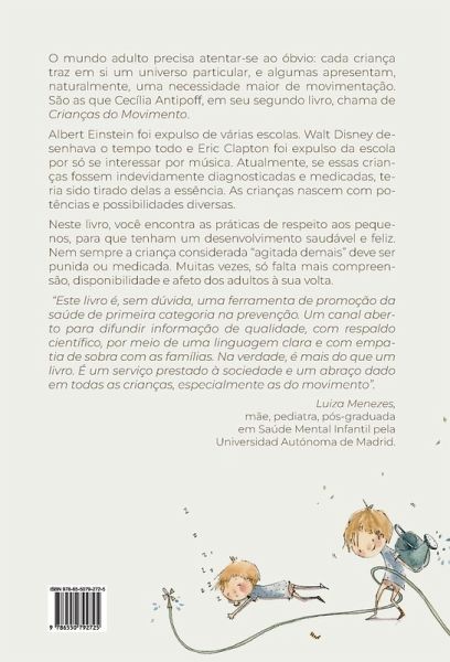O mundo adulto precisa atentar-se ao óbvio: cada criança traz em si um universo particular, e algumas apresentam, naturalmente, uma necessidade maior de movimentação. São as que Cecília Antipoff, em seu segundo livro, chama de Crianças do Movimento. Albert Einstein foi expulso de várias escolas. Walt Disney desenhava o tempo todo e Eric Clapton foi expulso da escola por só se interessar por música. Atualmente, se essas crianças fossem indevidamente diagnosticadas e medicadas, teria sido tirado delas a essência. As crianças nascem com potências e possibilidades diversas. Neste livro, você encontra as práticas de respeito aos pequenos, para que tenham um desenvolvimento saudável e feliz. Nem sempre a criança considerada ¿agitada demais¿ deve ser punida ou medicada. Muitas vezes, só falta mais compreensão, disponibilidade e afeto dos adultos à sua volta. ¿Este livro é, sem dúvida, uma ferramenta de promoção da saúde de primeira categoria na prevenção. Um canal aberto para difundir informação de qualidade, com respaldo científico, por meio de uma linguagem clara e com empa - tia de sobra com as famílias. Na verdade, é mais do que um livro. É um serviço prestado à sociedade e um abraço dado em todas as crianças, especialmente as do movimentö.
